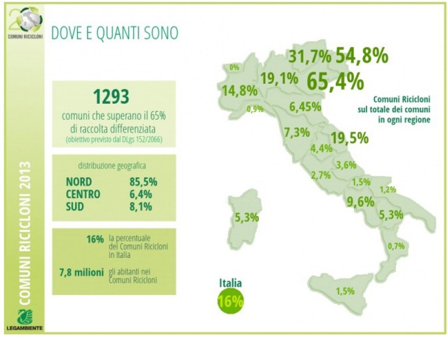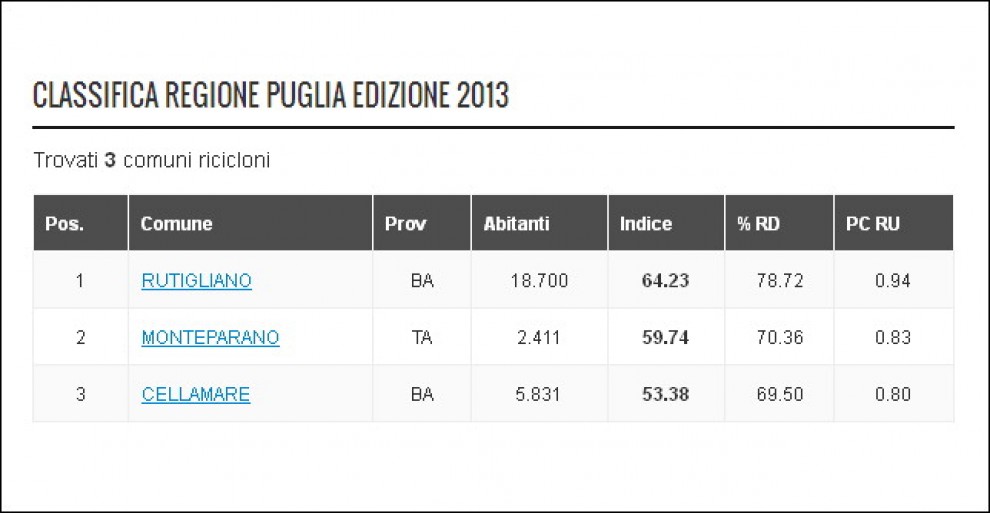 Questione rifiuti: la Puglia puo sorridere solo per le sue due new entry e per le speranze riposte in poche ma significative realta. Perche a guardare la fotografia su scala nazionale nella classifica redatta da Legambiente c’e ben poco da esultare: la regione langue sotto un cumulo di rifiuti, agli ultimi posti per raccolta differenziata, preceduta solo da Valle d’Aosta, Liguria e Calabria. Solo solo 3 su 258 (appena l’1,16% del totale), infatti, i paesi a essere stati insigniti del titolo di "Comune riciclone", nella consueta premiazione annuale, in base ai dati del 2012. E solo uno di questi supera i 10mila abitanti. Un mezzo disastro, soprattutto se si pensa alle percentuali fissate dall’ultimo piano regionale dei rifiuti che prevede il raggiungimento del 65% di separazione dei materiali: la stessa soglia fissata dalla onlus italiana per premiare i Comuni piu virtuosi, secondo i dettami di legge nazionale del decreto legislativo 152 del 2006. Nei punteggi della graduatoria contribuiscono anche fattori come i sistemi tariffari, i servizi domiciliari, la quantita di immondizia prodotta per cittadino o l’esistenza di piattaforme ecologiche. "La media percentuale in Puglia si attesta intorno al 20%, anche a causa della proroga al 2014 dell’ecotassa", spiega il presidente regionale di Legambiente, Francesco Tarantini. "Occorre una svolta - continua - che auspichiamo avvenga con l’approvazione del piano sulla gestione dei rifiuti solidi urbani affinche si realizzino alcune priorita quali l’impiantistica, soprattutto quella per il trattamento della frazione umida e la raccolta differenziata porta a porta". Proprio il servizio di ritiro casa per casa e stato il segreto per le citta vincitrici e inserite nel rapporto 2013. Cellamare, in provincia di Bari, ha raggiunto il 69,50% di differenziata entrando per la prima volta in lista, aggiungendosi a Monteparano, Taranto, fino all’anno scorso unico baluardo a rappresentare laregione (70,36% per il piccolo comune ionico). La regina di Puglia e Rutigliano, in provincia di Bari, che oltre ad aver toccato quasi 79 punti percentuali nel 2012 fa registrare la sua presenza tra i comuni rifiuti-free, ovvero quelli che hanno limitato la produzione di spazzatura pro capite a meno di 75 kg l’anno. Ancora, nell’area sud si sono distinti il Comune di Campi Salentina, Lecce, per la categoria Raee in Puglia, rifiuti da apparecchiature elettriche ed elettroniche, e quello di Andria (unico capoluogo di provincia citato nel rapporto) che ha invece ricevuto il titolo di "Emergente nell’emergenza", per il suo salto in avanti a partire da settembre 2012, fino al 65% in un mese. E i risultati nei primi mesi del 2013, con una media del 66,79% fino a giugno, lasciano ben sperare per la prossima edizione di "Comuni ricicloni". Un dato impressionante se si pensa che fino al 2011 la percentuale ottenuta superava di poco il 10. Anche in questo caso la chiave stanell’introduzione della raccolta porta a porta nella sesta provincia, che funziona nonostante i circa 100mila abitanti: e l’unico caso di capoluogo di provincia in Puglia che ha introdotto il servizio in maniera completa. Gianvito Rutigliano,repubblica