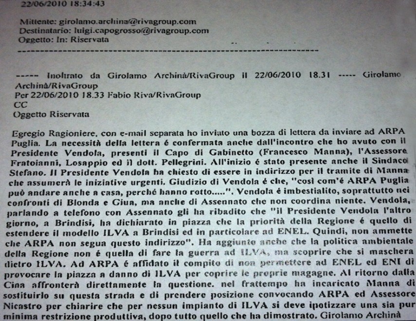 giudici, che si sarebbe consumato il pressing su Giorgio Assennato, direttore di Arpa. Con in prima fila Nichi Vendola. Uno dei risconti sarebbe quella intercettazione tra Archinà e il Presidente della Regione. Durante il colloquio il potentissimo dirigente Ilva manifestò le sue preoccupazioni sulla posizione di Arpa e sue eventuali ripercussioni sulla produzione del gigante dell’acciaio. "Abusando il Vendola, della sua qualità di Presidente della Regione - si legge nell’avviso di conclusione delle indagini - mediante minaccia implicita della mancata riconferma nell’incarico ricoperto, costringeva Assennato Giorgio, direttore di Arpa ad ’ammorbidirè la posizione di Arpa nei confronti delle emissioni nocive prodotte dall’impianto siderurgico dell’Ilva". L’accusa si fonda anche su altre intercettazioni, in cui, però, è spesso Archinà a riferire della posizione della Regione. Così si apprende che nel corso di una riunione il presidente Vendola avrebbe detto che "così com’è Arpa Puglia può andare a casa perché hanno rotto..., e ribadiva che in nessun caso l’attività produttiva dell’Ilva avrebbe dovuto subire ripercussioni". Sintomatico, a parere dei giudici, anche quanto accaduto in Regione pochi giorni dopo. Negli uffici regionali venne convocata una riunione con Emilio Riva, suo figlio Fabio e lo stesso Archinà. Mentre Assennato venne tenuto in anticamera. E durante l’attesa sarebbe stato ammonito dal dirigente "Antonello Antonicelli, su incarico del Vendola, a nonutilizzare i dati tecnici come ’bombe carta che poi si trasformano in bombe a mano"". E che quel pressing stesse fornendo i suoi frutti, insistono i pm del pool retto dal procuratore Franco Sebastio, è riscontrato da una mail spedita da Archinà a Fabio Riva in quei giorni, puntualmente intercettata dai finanzieri. In quella mail Archinà sostiene che Vendola ha intimato in Regione che "per nessun impianto di Ilva si deva ipotizzare una sia pur minima riduzione produttiva". Mario Diliberto e Giuliano Foschini,repubblica