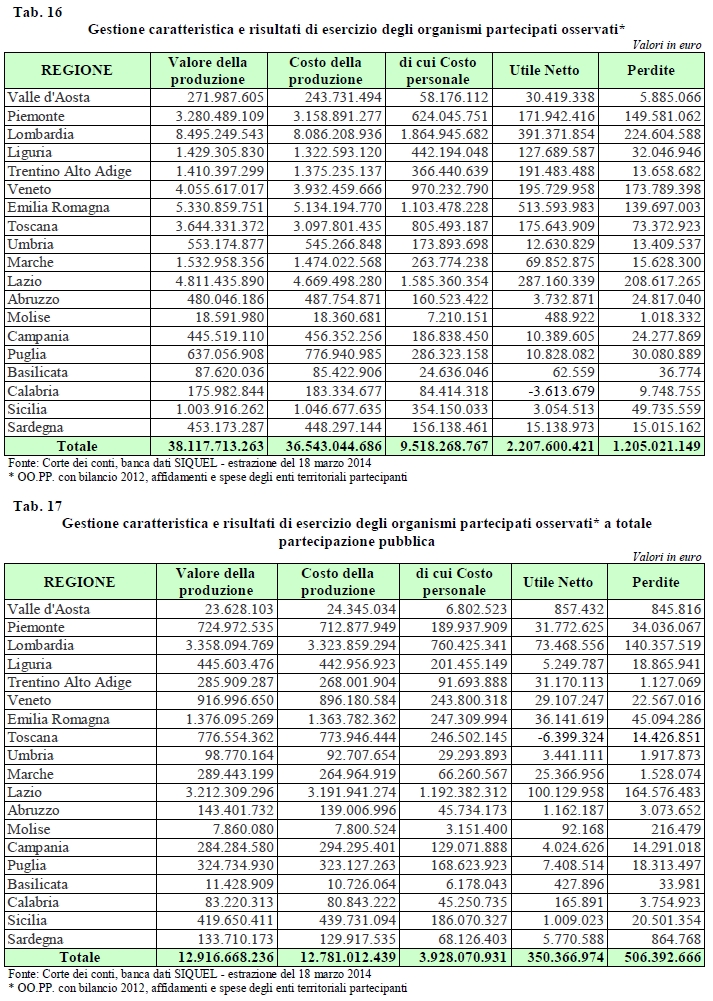 Sono 1.424, circa una su quattro, le partecipate da enti locali con un rendimento negativo rispetto al capitale investito (Roe). E’ quanto emerge da uno studio del commissario alla Spending Review, Carlo Cottarelli che passa a setaccio 5.264 società per le quali sono disponibili i conti del 2012 e che completa la relazione del gruppo di lavoro dedicato alle partecipate stesse, consegnata al Comitato interministeriale il 7 agosto scorso. "La pubblicazione di indici che misurino l’efficienza delle partecipate - è spiegato sul sito della spending review - può costituire un importante stimolo al miglioramento delle attività di queste società" e "come punto di partenza viene oggi pubblicato su questo sito un fondamentale indice di efficienza, il ’Return on Equity’ (Roe) calcolato come rapporto percentuale tra risultato netto e mezzi propri". Tra le partecipate degli enti locali, censite dal ministero dell’Economia, ce ne sono ben 1.075 i cui bilanci 2012 risultano, al momento, "off limits" anche per il commissario ai tagli. Nelle tabelle pubblicate oggi - senza che si arrivi a conclusioni o sintesi sui risultati - vengono indicate come società con "bilanci non disponibili", con sede in praticamente tutte le Regioni italiane: si va da aziende per il turismo ad associazioni per la formazione a consorzi per la tutela dei parchi. In aggiunta, ce ne sono 86 per le quali "i dati riportati nella banca dati del Tesoro non sono coerenti con quelli di altre banche dati utilizzate a fine di controllo e che quindi potrebbero contenere errori". Se nel complesso le partecipate sono stimate essere fino a 10mila dallo stesso commissario, che ha rivisto in eccesso il dato di 7.700 circa del Mef, dalle schede disponibili come supporto alla spending review emerge anche che ci sono 1.242 società non attive, dalla napoletana Arpac in liquidazione allo Zuccherificio del Molise. Sono poi 143 le società partecipate dagli enti locali che nei bilanci 2012 hanno patrimonio negativo o nullo. Le tre con un "rosso" maggiore sono l’immobiliare Cmv di Venezia (-20,3 milioni), la Fiera di Roma (15,7 milioni), la società di trasporti del Lazio Cotral (-14,9 milioni). "Occorre naturalmente interpretare questi indici con attenzione, perché il risultato di un singolo anno può essere influenzato da eventi straordinari. Da un singolo indice non si possono trarre conclusioni definitive sulla efficienza delle partecipate. Si tratta comunque di utile punto di partenza per ulteriori analisi", si spiega alla Revisione della spesa stessa. L’analisi di "redditivita" vera e propria viene così compiuta su 5.264 società. Oltre a quelle con redditività negativa, si segnalano 2.708 partecipate con un Roe superiore a zero ma inferiore al 10 per cento e 1.132 con una forte redditività, il cui Roe è a due cifre. Ma i dati possono essere spacchettati anche per i quattro livello di "grandezza" patrimoniale. E mostrano che le più piccole hanno un’incidenza di redditività negativa maggiore. Quelle con capitale fino a 10 mila euro sono solo 130, ma contano ben 67 dal Roe negativo, in pratica una su due. Quelle con una dimensione appena maggiore (tra 10 e 100 mila euro) sono 1.182: una su tre (337) hanno redditività sotto lo zero. Se si sale sopra questa soglia, ad avere un Roe negativo è in media una società su quattro. In particolare tra 100 mila euro e 1 milione di euro ci sono 1.662 società e tra loro 408 con Roe sotto zero. Sopra la soglia di 1 milione di capitale vengono invece contate 2.290 società, tra le quali 612 evidenziano un Roe con il segno meno. Guardando a migliori e peggiori performer, nella classe delle più piccole il peggior risultato va alla Wpp Uno Spa, che da informazioni reperibili online risulta attiva nel settore delle rinnovabili, con un Roe di -10.351% (ma bisogna tenere presente il settore d’investimento). Subito dopo, l’Azienda bergamasca multiservizi Information Communication Technology, con un Roe di -8.945%. Tra le aziende più grandi, invece, il primato per la minore redditività va alla Gestione agroalimentare molisana, che nel 2012 aveva poco più di 2 milioni di mezzi propri e un reddito netto negativo per 14,6 milioni. Va solo un po’ meglio alla Società per la trasformazione del territorio di Parma, che ha 5,7 milioni di patrimonio netto e perdite per 28 milioni. Nell’elenco figura anche Alitalia-Cai (Roe a -139%). In conclusione dalle partecipate degli Enti "si possono risparmiare 12,8 miliardi"