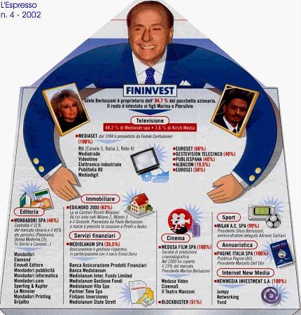 2 LIBRI S.P.A. EDITORIA A. ME. R. SRL - MILANO PUBBLICITA’ ACI MONDADORI S.R.L. EDITORIA ACTION GROUP EDITORIA AD EDITORIA AGENZIA LOMBARDA DISTR. GIORNALI E RIVISTE S.R.L. 50% EDITORIA ALBA SERVIZI AEROTRASPORTI - MI SERVIZI DI GRUPPO E DIVERSIFICATE ALBACOM (TELEFONIA FISSA E INTERNET) TELEFONIA ALIGHIERI SRL - MILANO SERVIZI DI GRUPPO E DIVERSIFICATE AMATORI RUGBY MILANO MEDIOLANUM SRL - MILANO CINEMA, SPETTACOLO, SPORT AMBROSIANA VITA SPA - MILANO ASSICURAZIONI E SERVIZI FINANZIARI AME PUBLISHING LTD EDITORIA ANFRI IMMOBILIARE SRL - SEGRATE (MI) SERVIZI DI GRUPPO E DIVERSIFICATE ARAM SPA - MILANO ASSICURAZIONI E SERVIZI FINANZIARI ARNOLDO MONDADORI DEUTSCHLAND GMBH EDITORIA ARNOWEB S.A. EDITORIA ARTES GRAFICAS TOLEDO S.A. EDITORIA ASSOFIN SPA - MILANO ASSICURAZIONI E SERVIZI FINANZIARI ATHENA FINANZIARIA S.R.L. EDITORIA AUDITEL SRL - MILANO TELEVISIONE AUTO OGGI EDITORIA AUTOMOBILE CLUB EDITORIA BAMBIEDITORIA BANCA ASSICURAZIONE PRODOTTI FINANZIARI ASSICURAZIONI E SERVIZI FINANZIARI BANCA FINANZA GIORNALE ASSICURAZIONI EDITORIA BANCA MEDIOLANUM SPA - MILANO 3 BASIGLIO (MI) ASSICURAZIONI E SERVIZI FINANZIARI BLOCKBUSTER CINEMA, SPETTACOLO, SPORT BLU TELEFONIA BOL BOOKS ON LINE S.P.A. EDITORIA BONOMI E PAGANI - BOPA SRL - MILANO SERVIZI DI GRUPPO E DIVERSIFICATE BROKERS FIVE SRL - MILANO ASSICURAZIONI E SERVIZI FINANZIARI BULL LTD - BRITISH VIRGIN ISLANDS SERVIZI DI GRUPPO E DIVERSIFICATE CALCIO 2000 EDITORIA CANALE 5 MUSIC SRL - MILANO TELEVISIONE CANTIERI RIUNITI MILANESI SPA - MILANO SERVIZI DI GRUPPO E DIVERSIFICATE CASA EDITRICE FELICE LE MONNIER S.P.A. EDITORIA CASA EDITRICE POSEIDONA S.R.L. EDITORIA CASA FACILE EDITORIA CASA IDEA EDITORIA CASA VIVA EDITORIA CASABELLA - ALMANACCO ARCHITETTURA EDITORIA CEMIT INTERACTIVE MEDIA S.P.A. EDITORIA CENTRO COMMERCIALE MILANO 3 SRL - MILANO ASSICURAZIONI E SERVIZIFINANZIARI CHI EDITORIA CIAK EDITORIA CINEMA 5 GESTIONE SPA - ROMA CINEMA, SPETTACOLO, SPORT CINEMA 5 SPA - ROMA CINEMA, SPETTACOLO, SPORT CIP & CIOP EDITORIA COLORA DISNEY EDITORIA COLORA WINNI THE POOH EDITORIA CONDE’ NEST EDITORIA CONFIDENZE EDITORIA CONSORTIUM SPA - MILANO SERVIZI DI GRUPPO E DIVERSIFICATE CONSORZIO AEROMOBILI FININVEST (CAFIN) - MILANO SERVIZI DI GRUPPO E DIVERSIFICATE CONSORZIO ELICOTTERI FININVEST (CEFIN) - MILANO SERVIZI DI GRUPPO E DIVERSIFICATE COSMOPOLITAN EDITORIA CREARE CON CASAVIVA EDITORIA CUCINA MODERNA EDITORIA DANIA FILM SRL - ROMA CINEMA, SPETTACOLO, SPORT DELTA SRL - MILANO CINEMA, SPETTACOLO, SPORT DISNEY ENIGMISTICA EDITORIA DISTRIB. EXCL. GRIJALBO S.A. (COLOMBIA) EDITORIA DONNA IN FORMA EDITORIA DONNA MODERNA EDITORIA E. I.S. SRL - SESTO SAN GIOVANNI (MI) SERVIZI DI GRUPPO E DIVERSIFICATE E.BIS MEDIA S.R.L. EDITORIA E.I.S. PROGETTI SRL - SESTO SAN GIOVANNI (MI) SERVIZI DIGRUPPO E DIVERSIFICATE E.I.S. ROMA SRL - SESTO SAN GIOVANNI (MI) SERVIZI DI GRUPPO E DIVERSIFICATE ED. E FINANZIARIA LE MONNIER S.P.A. EDITORIA EDICIONES MUSICALES CINCO S.A. - MADRID TELEVISIONE EDILNORD 2000 SERVIZI DI GRUPPO E DIVERSIFICATE EDITORIAL GRIJALBO S.A. (CILE) EDITORIA EDITORIAL GRIJALBO S.A. (MESSICO) EDITORIA EDITRICE PENTA SRL - MILANO EDITORIA EDITRICE PORTORIA S.P.A. EDITORIA EDIZIONI DI COMUNITA’ S.R.L. EDITORIA EDIZIONI EL S.R.L. EDITORIA EDIZIONI ELECTA BRUNO MONDADORI S.R.L. EDITORIA EDIZIONI FRASSINELLI S.R.L. EDITORIA EGEO ’82 SRL - MILANO SERVIZI DI GRUPPO E DIVERSIFICATE EINAUDI EDITORE EDITORIA ELECTA NAPOLI EDITORIA ELEMOND EDITORIA ELEMOND S.P.A. EDITORIA ELETTRONICA INDUSTRIALE SPA - LISSONE (MI) TELEVISIONE ESERCIZIO SCHERMI ITALIANI SRL - ROMA CINEMA, SPETTACOLO, SPORT ESPANSIONE EDITORIA ESSELUNGA GRANDE DISTRIBUZIONE ESSETICI SRL (SERVIZI TEATRALI E CINEMATOGRAF. SRL) - MILANO SERVIZIDI GRUPPO E DIVERSIFICATE EUROLOTERIE GIBILTAR LTD - GIBILTERRA SERVIZI DI GRUPPO E DIVERSIFICATE EUROLOTERIE S. A. - LUSSEMBURGO SERVIZI DI GRUPPO E DIVERSIFICATE EUROMOBILIARE SPA - MILANO ASSICURAZIONI E SERVIZI FINANZIARI EUROPA AGENCY LTD - MALTA SERVIZI DI GRUPPO E DIVERSIFICATE EUROPA INVEST S. A. - LUSSEMBURGO ASSICURAZIONI E SERVIZI FINANZIARI EUROPE 5 S. A. - PARIGI TELEVISIONE EUROPE 5 S. A. IN LIQUIDAZIONE - PARIGI TELEVISIONE EUROSET (TELEVISIONE/KIRCH MEDIA) TELEVISIONE FIBANK INVERSIONES S.A. - (BARCELLONA) ASSICURAZIONI E SERVIZI FINANZIARI FIED SPA - MILANO EDITORIA FINEDIM ITALIA SPA - MILANO SERVIZI DI GRUPPO E DIVERSIFICATE FINGROSS SRL - FINANZIARIA GROSSISTI DI PARTECIPAZIONI - ROMA SERVIZI DI GRUPPO E DIVERSIFICATE FININTEL SPA - MILANO SERVIZI DI GRUPPO E DIVERSIFICATE FININVEST COMUNICAZIONI SRL - MILANO SERVIZI DI GRUPPO E DIVERSIFICATE FININVEST FIDUCIARIA SPA - SEGRATE (MI) ASSICURAZIONI E SERVIZIFINANZIARI FININVEST ITALIA SPA - MILANO ASSICURAZIONI E SERVIZI FINANZIARI FININVEST LTD - LONDRA TELEVISIONE FININVEST SERVICE S. A. - MASSAGNO - SVIZZERA SERVIZI DI GRUPPO E DIVERSIFICATE FININVEST SERVIZI SPA - SEGRATE (MI) SERVIZI DI GRUPPO E DIVERSIFICATE FINMEDIA SRL - MILANO TELEVISIONE FINSIMAC SPA - MILANO CINEMA, SPETTACOLO, SPORT FIVE INTERNATIONAL SRL - MILANO SERVIZI DI GRUPPO E DIVERSIFICATE FIVE VIAGGI SRL- MILANO SERVIZI DI GRUPPO E DIVERSIFICATE FOCUS EDITORIA FOCUS EXTRA EDITORIA FORZA MILAN EDITORIA FUTURA FINANZIARIA SRL - MILANO ASSICURAZIONI E SERVIZI FINANZIARI G. & G. ELECTRIC SRL - SESTO SAN GIOVANNI (MI) SERVIZI DI GRUPPO E DIVERSIFICATE G. R. T. - GESTIONI RADIO TELEVISIVE SPA - MILANO CINEMA, SPETTACOLO, SPORT GAMAX BROKER POOL A.G. - LEVERKUSEN (GERMANIA) ASSICURAZIONI E SERVIZI FINANZIARI GESTEVISION S. A. - MADRID TELEVISIONE GESTIONE FONDI FININVEST SPA - SEGRATE (MI) ASSICURAZIONI E SERVIZIFINANZIARI GESTIONE IMPIANTI MILAN SRL - SEGRATE (MI) CINEMA, SPETTACOLO, SPORT GESTIONI ESTERE SPA - SEGRATE (MI) ASSICURAZIONI E SERVIZI FINANZIARI GESTIONI INTERNAZIONALI SPA - SEGRATE (MI) ASSICURAZIONI E SERVIZI FINANZIARI GIULIO EINAUDI EDITORE S.P.A EDITORIA GLAMOUR EDITORIA GO - PANORAMA TRAVEL EDITORIA GQ EDITORIA GRAND GOURMET EDITORIA GRANDI EVENTI SRL - MILANO PUBBLICITA’ GRAZIA EDITORIA GRAZIA ACCESS