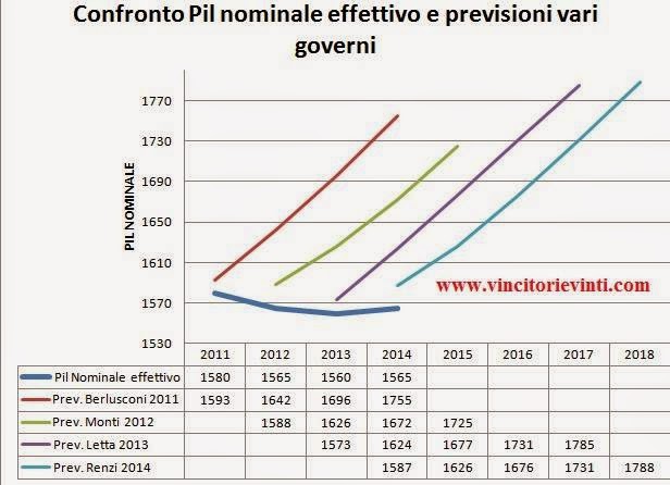 Su Twitter mi è capitato di incrociare un grafico tanto semplice quanto illuminante. Lo ha realizzato Paolo Cardena, consulente finanziario che anima il blog Vincitori e Vinti e che ringrazio per avermi autorizzato a condividere qui il suo lavoro. Il grafico in questione mostra a colpo d’occhio quanto gli ultimi quattro esecutivi abbiano clamorosamente sbagliato le loro previsioni sulla ripresa, promettendo miglioramenti del Pil che, alla prova dei fatti, non si sono mai manifestati. La curva blu scura in alto mostra il Pil nominale effettivo, cioè quello reale, mentre le rette colorate “raccontano” le previsioni fatte dai diversi esecutivi e che, lette oggi, fanno quasi ridere se non si trattasse di un argomento fin troppo serio. Berlusconi, Monti, Letta e anche Renzi: indipendentemente dal colore politico la previsione si è rivelata sempre fuori misura. E anche di parecchi miliardi. Quanto visto sopra sono dati puri e semplici. Ovviamente ogni esecutivo puòavanzare le sue giustificazioni: chi si lamenterà di non aver avuto la maggioranza giusta per dare una svolta alle cose, chi non poteva prevedere la crisi ecc ecc. Le valutazioni politiche, comunque doverose, non sono interesse di questo breve post. Però il grafico in questione è meglio tenerlo tra i preferiti. Sono sicuro che presto tornerà comodo… Mauro Munafò,l’espresso
