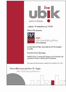 “Non è una faccenda personale. I fatti raccontati nel libro riguardano beni pubblici. Per questo è uno scandalo politico.” È la dichiarazione di Marco Lillo a proposito del libro Papi – uno scandalo politico, l’ultimo “instant book” edito da Chiarelettere, scritto con Marco Travaglio e Peter Gomez. Sabato 19 settembre (ore 19.15), nello spazio live della libreria Ubik di Foggia (Piazza U. Giordano, 76) il giornalista del settimanale l’Espresso e futuro redattore, dal 23 settembre, del nuovo giornale Il Fatto Quotidiano, presenta l’ultima inchiesta sul Cavaliere. Coordina l’incontro, Enzo Verrengia. “Si parla di candidati alle elezioni, cose che riguardano la selezione della futura classe politica italiana. Inoltre, viene mostrata l’arbitrarietà del Presidente del Consiglio, il quale contrabbanda una falsa vita privata che pone come facciata davanti a potenziali elettori, chiedendo loro il voto e presentandosi così come in realtà non è.” Eccoperché, nelle parole dell’autore Marco Lillo, il “caso-veline” che ha coinvolto Silvio Berlusconi non deve essere considerato come una “faccenda personale”. Il sottotitolo del libro Papi, pertanto, è emblematico: Noemi e le veline candidate e scandidate dal cavaliere di hardcore. Puttanopoli e voli di stato, scatti e ricatti. Perché il caso Berlusconi non è una faccenda personale. La formula, ancora una volta, è quella dell’instant book, caro alla casa editrice Chiarelettere, capace di stampare libri su eventi nazionali quando questi sono ancora attuali. “Una formula necessaria – secondo Marco Lillo – perché permette di raccontare ciò che attualmente i giornali italiani non raccontano.” L’autore si sofferma anche sulla nuova esperienza del Fatto Quotidiano, in edicola dal 23 settembre, di cui parlerà durante l’incontro alla libreria Ubik: “sarà la naturale prosecuzione degli instant book, ma applicata alla quotidianità. Una grande scommessa – ammette Lillo –, fondare un giornaleche non ha padroni con conflitti di interesse e che vuole raccontare quotidianamente ciò che attualmente si può leggere solo sui libri. Ci sarò io, ci saranno Travaglio, Gomez e altri. E cercheremo di fare puro giornalismo investigativo, tentando di presentare e di indagare un evento anche a prescindere dalle indagini”. “Abbiamo invitato Marco Lillo per presentare il suo libro perché pensiamo che il lavoro giornalistico di tanti professionisti come lui è una garanzia di libertà per il nostro paese”. A dichiararlo è Michele Trecca, direttore artistico della libreria Ubik. Redattore de l’Espresso dal 2000, collaboratore di Micromega, tra i fondatori e futuri giornalisti del prossimo giornale nazionale Il Fatto Quotidiano, in uscita ufficiale il 23 settembre, Marco Lillo è uno dei più importanti giornalisti investigativi d’Italia. A lui si devono inchieste esclusive come “Calciopoli”, “Casa Nostra” (le case degli enti affittate e poi svendute ai politici a prezzi di favore) e “ProntoRai” (caso Berlusconi-Saccà), tutte pubblicate dal settimanale l’Espresso. È autore, con l’attrice Sabina Guzzanti, di “Reperto Raiot”. Ed è co-autore del libro “Bavaglio” (Chiarelettere 2008), scritto con Marco Travaglio e Peter Gomez.