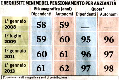 Dall’inizio dell’anno prossimo, per il calcolo della pensione, verranno applicati i nuovi parametri ribassati tra il 6,38 per cento e l’8,41 per cento. Legati alle migliori aspettative di vita. Per Cgil perdite almeno del 3-4%. Il sindacato chiede di modificare i criteri e non applicarli retroattivamente su tutti i contributi. Dal primo gennaio 2010 entreranno in vigore i nuovi coefficienti di trasformazione delle pensioni. Ovvero quegli elementi che vengono utilizzati per calcolare il valore della pensione. I nuovi parametri, che verranno applicati a partire dall’anno prossimo, rispetto a quelli impiegati fino ad ora sono ribassati, a seconda dell’età, di un valore compreso tra il 6,38 per cento e l’8,41 per cento . Perdite del 3-4 per cento. Gli impatti saranno diversi a seconda del sistema con cui viene calcolata la propria pensione. La Cgil ha stimato che, con l’applicazione automatica dei nuovi coefficienti di calcolo del montantecontributivo, chi va in pensione oggi con il sistema misto (contributivo-retributivo) perderà circa il 3-4 per cento della pensione. La perdita sarà ancora maggiore per chi va in pensione con il sistema retributivo. Per questo Cgil ha chiesto di modificare i criteri di calcolo dei coefficienti di trasformazione e di applicarli "pro quota" solo sul montante contributivo dal 2010 in poi e non retroattivamente su tutti i contributi. Andare in pensione con le quote. A gennaio 2010, e per tutto il 2010, varrà pure il meccanismo delle quote per l’accesso al pensionamento di anzianità (introdotto dalla legge 247 del 24 dicembre del 2007) in vigore già da luglio 2009. Possono andare in pensione coloro che hanno compiuto almeno 59 anni e hanno 36 anni di contributi. Il meccanismo delle quote fa sì quindi che si può andare con 35 anni di contributi ma solo se si sono compiuti almeno i 60 anni d’età. Fino alla fine di giugno 2009, i requisiti minimi erano di 58 anni con 35 anni dicontributi. A partire dal gennaio 2011 invece, per andare in pensione di anzianità, si dovrà toccare quota “96”: ovvero potrà andarci chi avrà compiuto 60 anni di età e avrà 36 anni di contributi o 61 anni con 35 anni di contributi. Di seguito la tabella con la somma di età anagrafica e anzianità contributiva e l’età anagrafica minima secondo la legge 247.