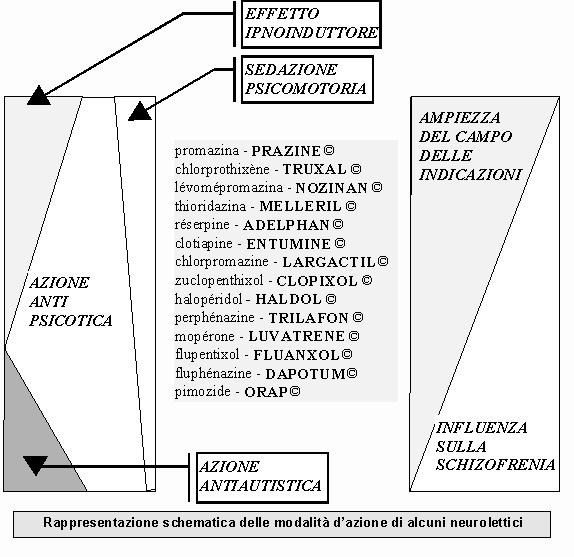 La cloropromazina, sintetizzata a Parigi nel 1950, è il capostipite di questi composti. Venne dapprima utilizzata in sala operatoria per potenziare l’anestesia, oppure per pazienti con crisi dolorose non trattabili, in associazione a narcotici e barbiturici. Si notò, però, che la cloropromazina aveva anche una proprietà particolare, detta "lobotomia farmacologica", ovvero la proprietà di indurre uno stato di ottundimento di sensi, riflessi e pensiero. Introdotti nella pratica psichiatrica nel 1953, i neurolettici diventarono presto la "camicia di forza chimica" utilizzata in tutti i manicomi, prendendo così il posto dei barbiturici, degli shock da insulina, degli elettroshock e della lobotomia. Oltre all’effetto antipsicotico già a bassi dosaggi, la cloropromazina (componente dei neurolettici) è stata a lungo utilizzata per i suoi effetti antinausea, antivomito, antivertigine, alcuni tipi di somatizzazione e di cefalea. Grazie all’enorme successo commerciale della clorpromazina la ricerca dei nuovi neurolettici era comunque avviata, infatti nel giro di una decina di anni si giunse all’individuazione e alla messa a punto di quasi tutte le maggiori classi di prodotti antipsicotici di cui disponiamo attualmente. La ricerca ci ha portato ora a disporre di una ventina di diverse fenotiazine, prodotti assai simili strutturalmente alla clorpomazina. Oltre alle fenotiazine troviamo quindi tioxanteni, le dibenzazepine, butirrofenone, difenilbutilpiperidine ed altre ancora. Tutti questi farmaci possono produrre effetti collaterali articolari costituiti da tremori, rigidità, riduzione della mimica facciale. Aspetti clinici Gli antipsicotici presentano un’azione prevalentemente antidelirante e antiallucinatoria. Vengono impiegati prevalentemente per la terapia della schizofrenia e di altre manifestazioni psicotiche. Possono essere somministrati per via orale, intramuscolare, e per via venosa. Alcuni tra i farmaci più diffusi in questa categoria sono: Serenase - Haldol - Largagtil - Moditen - Melleril - Nozinan - Orap Assunti a dosaggi adeguati riducono il delirio, le allucinazioni (le voci), i comportamenti devianti degli psicotici, favorendone il reinserimento sociale. Assunti da un soggetto non psicotico, non producono uno stato di sedazione quanto piuttosto una estrema indifferenza agli stimoli ambientali e un fortissimo appiattimento emotivo. Non inducono né assuefazione né dipendenza, non sono particolarmente tossici, ma possono produrre però importanti e consistenti effetti collaterali: riduzione della mimica facciale, rigidità e tremori muscolari simili al morbo di Parkinson. Gli effetti collaterali Gli effetti più frequenti sono: sedazione, sonnolenza, difficoltà di pensiero, apatia, secchezza delle fauci, eccessiva salivazione, problemi mestruali, problemi sessuali, aumento di peso, difficoltà ad urinare, confusione, nausea, abbassamenti di pressione, insonnia. Per controllare i tremori provocati dall’uso dei neurolettici, spesso alla persona vengono somministrati farmaci antiparkinsoniani (su tutti il Disipal). La persona che assume neurolettici spesso si sente stordita, fa fatica a connettere e ad associare le idee fra loro, si sente staccata dalla realtà come se tutto fosse ovattato. Gli antipsicotici possono anche incidere sul comportamento causando cambiamenti repentini di umore, periodi di calma alternati a periodi di iperattività, inusuali modi di parlare, incluso il "parlare senza mira" o a voce molto alta. Disturbi extrapiramidali Sono gli effetti di più comune riscontro. I disturbi extrapiramidali indotti dai neurolettici sono: distonia acuta, acatisia, parkinsonismo, discinesia tardiva e rabbit syndrome. Li descriviamo di seguito. Distonia acuta E’ rara ma è dolorosa e debilitante. Insorge precocemente (secondo alcune stime nel 90% dei casi entro i primi 5 giorni dall’ inizio del trattamento). E’ caratterizzata da torcicollo doloroso, movimenti degli occhi verso l’alto, tic della palpebra, contrazioni dolorose della schiena con difficoltà a camminare, raramente contrazioni dei muscoli laringei con difficoltà a parlare (intesa come voce rauca, sino all’afonia) e a respirare, fino al soffocamento. Acatisia E’ l’incapacità di stare fermi, l’individuo si muove continuamente e con dondolamenti, battendo i piedi o le dita, spostando il peso del corpo da una parte all’altra mentre sta in piedi. Parkinsonismo I segni più tipici sono rigidità, tremori e bradicinesia (movimenti lenti) come avviene nei soggetti affetti da morbo di Parkinson. Possono inoltre essere presenti scialorrea (= eccesso di salivazione), disturbi del linguaggio e disturbi della scrittura. Un’estrema forma di parkinsonismo è l’"effetto zombie’’ dato da portamento rigido, quasi mutismo, apatia, sguardo assente. L’incidenza della sindrome parkinsoniana varia, a seconda degli studi considerati, dal 20 al 40% dei casi. Di solito è reversibile dopo alcune settimane dalla sospensione del trattamento con neurolettici, ma in certi casi può persistere per mesi od anni. Per controllare i sintomi parkinsoniani vengono usati farmaci antiparkinsoniani, ma questa associazione, soprattutto se prolungata nel tempo può aumentare il rischio di discinesia tardiva (vedi sotto). Discinesia tardiva E’ il più grave degli effetti extrapiramidali. E’ caratterizzata dalla presenza di movimenti involontari (discinetici) a carico della muscolatura della bocca, delle labbra e della lingua. Spesso possono essere colpiti anche i muscoli degli arti e del tronco. Tali movimenti si attenuano o scompaiono durante il sonno, mentre aumentano in condizioni di tensione emotiva. Sono movimenti ripetuti e ritmati tipo: succhiare, baciare, piegare le labbra, soffiare, masticare, protendere la lingua. Comuni sono anche i tic facciali e le smorfie e si possono osservare movimenti incontrollati delle dita, sbattere dei piedi ed altri movimenti insoliti. Tali effetti possono essere molto v