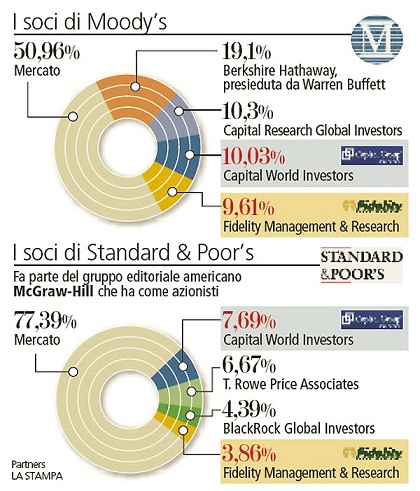 Nessuno le controlla, sono una manciata a livello mondiale, ma tre fanno il bello e cattivo tempo. Declassano intere economie e debiti di paesi sovrani. Le agenzie di rating, sono piene di conflitti d’interessi e corresponsabili di una crisi sistemica mondiale.[1] Nonostante le dichiarate doti chiaroveggenti, sono state “incapaci” di vedere l’avvicinarsi della crisi americana dei sub-prime nel 2007, prodotti da loro dotati di tripla A, fino al giorno del loro crollo; non sono riuscite a prevedere la crisi del debito sovrano della zona euro, come sottolinea il Fondo Monteario Internazionale, e neppure il fallimento della Lehman Brothers nel 2008.[2] Fino all’ultimo non si accorsero di nulla, come mai? Sviste? Incapacità professionale? O strategie mirate? Per dare una risposta, è necessario osservare chi le controlla. Verranno analizzate in proporzione alla quota di mercato del settore rating. http://4.bp.blogspot.com/-h_e9pqLcU5U/TfstbMyce1I/AAAAAAAAAOo/EeyxC0yzxZ4/s1600/moodys+logo+1.jpgMoody’s Corporation Fondata nel 1909 è presente in 26 paesi e ha circa 4500 impiegati. Rappresenta il 40% della quota di mercato del settore rating La sede principale si trova a New York, nella Sixt Avenue. I proprietari di Moody’s sono: - Berckshire Hathaway Inc. (Warren E. Buffet): 12,80% - Capital World Investors: 12,60% - The Vanguard Group Inc. (5,02%) - Price (T. Rowe) Associates Inc. : 5,95% - BlackRock Fund Advisors (3,68%) - State Street Global Advisors (3,24%) - Decine di altri investitori Arnold: The Rothschilds’ Man in CaliforniaIl 24 settembre 2002 un elicottero è atterrato sul prato di Waddedson Manor nella proprietà nel Buckinghamshire, in Inghilterra. Dall’elicottero sono scesi WarrenBuffet (a sinistra), ufficialmente il secondo uomo più ricco del mondo, in realtà un giocatore di basso rango e Arnold Schwarzenegger, a quel tempo candidato Governatore della California. Il patron di casa era nientepopodimenoche Nataniel Charles Jacob Rothschild (a destra), erede della dinastia europea di fantamiliardari e uno degli uomini più influenti e potenti del mondo. Warren Buffet è infatti uno dei tanti agenti Rothschild. http://a.mytrend.it/irs/-0001/11/352510/o.58327.jpgStandard & Poor’s Fondata nel 1860 è presente in 23 paesi e impiega circa 10.000 persone. Rappresenta il 39% della quota di mercato del settore rating. La sua sede principale si trova a New York. La proprietà è di McGraw-Hill Companies Inc., il colosso delle comunicazioni, dell’editoria e costruzioni, presente in quasi tutti i settori economici. Il presidente di McGraw-Hill è HaroldMcGraw III, membro del Board of Directors della United Technologies (multinazionale statunitense dell’aviazione e armamenti) e membro del Committee on Directors Affairs della Conoco Phillips (colosso del petrolio ed energia). Gli azionisti della McGraw-Hill sono[3]: - Capital World Investors (10,26%), - The Vanguard Group Inc. (4,58%), - BlackRock Fund Advisors (4,47%), - State Street Global Advisors (4,25%), - Oppenheimer Funds Inc. (4,04%), - JANA Partners LLC (3,48%), - e decine di altri investitori. Al primo posto tra gli azionisti di McGraw-Hill, figura il Capital World Investors: una delle più grandi società di gestione del risparmio U.S.A.[4]. Oggi Capital è il primo azionista di McGraw Hill (il gruppo che controlla Standard & Poor’s) e nello stesso tempo è anche il primo socio della concorrente Moody’s.[5] Un altro affezionato alle agenzie di rating è il fondo americano: State Street Corp. State Street infatti è il secondoazionista di McGraw Hill/Standard & Poor’s e il settimo di Moody’s. Gli azionisti di State Street Corporation sono: - Barlays Plc, - Citigroup Inc., - General Electric Co., - Invesco International Ltd., - Northern Trust Corp., - Putnam LLC, - Vanguard Group, Lo stesso dicasi per l’altro fondo USA, BlackRock: è l’undicesimo socio di Moody’s e il sesto della concorrente. Gli azionisti attuali di BlackRock Financial Management Inc. sono: Merrill Lynch & Co. (49,8%) e P.N.C. Financial Services Group Inc. La banca d’investimento Merrill Lynch nel settembre 2008, dopo la crisi finanziaria e un periodo di forti perdite è stata acquistata dalla Bank of America, i cui azionisti sono: Barclays Plc., FMR Corporation, State Street Corporation, Axa, Putnam LLC, Vanguard Group, Capital Research & Management Inc., e pochi altri. Continuando a spulciare, si ritrovano sempre e solo gli stessi nomi, gli stessi azionisti che da una parte e dall’altracontrollano i gruppi bancari o i fondi d’investimento che a loro volta controllano le agenzie di rating. Non è strano quindi che a Lisbona la Procura ha aperto un’inchiesta dopo aver ricevuto una denuncia da alcuni professori che puntano il dito proprio sul fatto che i principali azionisti di Moody’s e Standard & Poor’s siano gli stessi grandi fondi americani. In pratica i grandi fondi USA sono da un lato gli investitori che utilizzano i rating per decidere quali obbligazioni comprare, e dall’altro sono anche i "padroni" delle agenzie che stilano le pagelle.[6] Non male come conflitto d’interesse. Ma tale conflitto è ancora più occulto e gravoso se pensiamo che oggi pochissime famiglie, come per esempio i Rothschild, sono in grado di controllare tutto quanto attraverso agenzie, società e agenti. Banchieri/filantropi/agenti come Warren Buffet e George Soros, tanto per citare i più famosi, che servono la causa speculando a destra e a manca con i loro fondimiliardari. La strategia è sempre la stessa: Problema-Reazione-Soluzione. Accendono la miccia e scatenano le guerre nei vari paesi, per distruggere tutto quello che si può distruggere, per poi ricostruire, guadagnandoci sopra. Declassano i debiti nazionali, per poi specularci sopra e alla fine comprare le aziende e società importanti con gli spiccioli. Ecco quello che è successo in Italia. Nel mese di agosto 1992, Standard & Poor’s declassa il debito italiano e casualmen