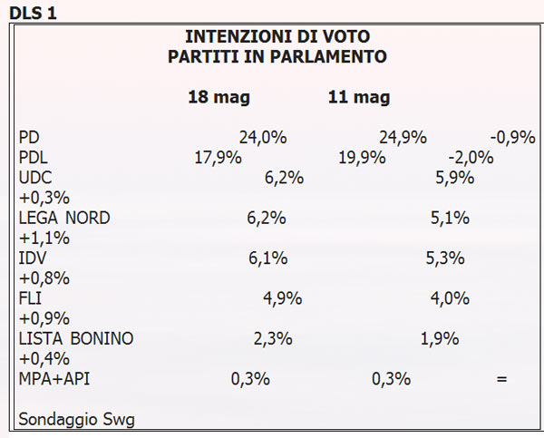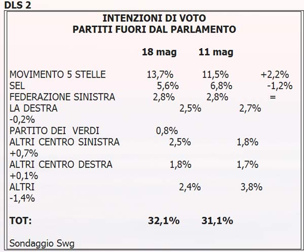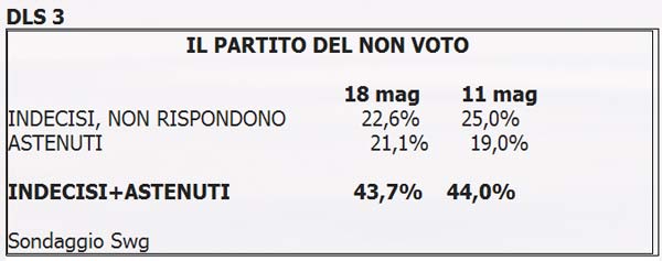 Titolo del sondaggio: intenzioni di voto Tema del sondaggio: politica Soggetto realizzatore: SWG Srl-Trieste Committente e acquirente: osservatorio SWG Data di esecuzione: 15-17 maggio 2012 Metodologia di rilevazione: sondaggio telefonico (CATI) e online con metodo CAWI -su un campione casuale probabilistico stratificato e di tipo panel ruotato di 900 soggetti maggiorenni (su 3250 contatti complessivi), di età superiore ai 18 anni. Il campione intervistato online è estratto dal panel proprietario SWG. Tutti i parametri sono uniformati ai più recenti dati forniti dall’ISTAT. I dati sono stati ponderati al fine di garantire la rappresentatività rispetto ai parametri di sesso, età e macro area di residenza. Margine d’errore massimo: ± 3,3% Il documento completo è disponibile sul sito: www.sondaggipoliticoelettorali.it |