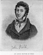 La storia dell’umanità è fatta da coloro che riescono ad incidere sul mondo sia con proprie compiute opere o già solo suscitando quella scintilla che, attraverso la genialità d’altri, genererà fuochi calorosi ed illuminanti. Ed è quest’ultimo il ruolo più significativo svolto nella storia della musica da John Field, compositore e pianista irlandese, nato a Dublino il 26 luglio 1782, figlio di Robert, pastore protestante e suonatore di violino, e nipote di nonno John, che gli darà le prime lezioni di pianoforte. All’età di dieci anni, con la famiglia, si trasferisce a Londra. Qui avrà modo di studiare con Muzio Clementi. Sarà poi a Vienna e Parigi, fino ad approdare in Russia, dove si sposerà ed acquisterà una sua fama di artista. Girerà per l’Europa, sarà anche a Napoli. Finirà i suoi giorni a Mosca, il 23 gennaio 1837. È autore di ben sette concerti per pianoforte ed orchestra, sonate, fantasie, rondò, studi, danze, variazioni, masoprattutto diciotto notturni per pianoforte, forma musicale che a lui deve precipua paternità, sostanzialmente composizioni brevi, dal tono lirico, dove una melodia toccante e cantabile è sostenuta da un accompagnamento sommesso a suscitare proprio un’atmosfera di raccoglimento intimo serotino. Una forma musicale che stimolerà la creatività di insigni epigoni come Chopin, Scriabin, Fauré o Satie, con noti, gradevolissimi risultati. Oggi i notturni di John Field vanno quindi ascoltati anche per il loro valore documentario, chiarificatore degli sviluppi che questo genere avrà poi nella storia ed esaltatore delle meraviglie che attraverso l’ingegno altrui saprà suscitare. L’atmosfera di questa sorta di composizione è sognante ed incantata, la sonorità del pianoforte inclina ad innalzarsi al di sopra della sua terrena fisicità meccanica fatta di brevi suoni di percussione per nobilitarsi, attraverso la sapiente distribuzione dei suoni dell’accompagnamento ed il prezioso effetto dipersistenza di questi nell’aria anche, in virtù dell’uso del pedale destro, dopo che il dito ha lasciato il tasto, in impalpabilità estatica, quasi sovrannaturale. E se il risultato emotivo delle pagine dell’irlandese non è altrettanto pregno, magico, toccante, intimamente comunicativo, meravigliosamente ineffabile come quello dei notturni di Chopin (si confronti già solo il primo, l’op. 9 n. 1, del compositore polacco), il merito di John Field resta incontestabilmente tutto in quell’intuizione estetica, autentica profezia artistica che ha preziosamente offerto l’humus nutriente e solido in cui il genio di Żelazowa Wola seppe poi affondare abbaglianti, ispiratissime radici.