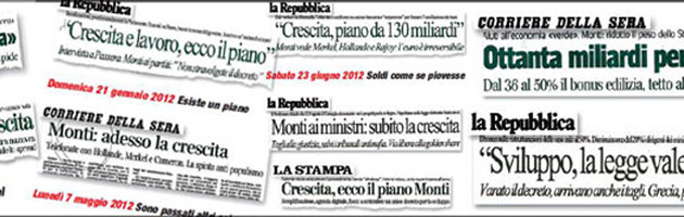 “Ci siamo dati la consegna del silenzio”, rispondevano i nuovi ministri tecnici nei primi giorni del sobrio governo Monti. Poi Monti andò a Porta a Porta e si aprirono le cateratte. Una cascata di esternazioni, annunci, promesse, proclami, boutade, intimazioni, giuramenti, ultimatum, penultimatum, scadenze, slogan, parole d’ordine ma soprattutto in libertà. Intendiamoci. La politica delle chiacchiere non è una novità: i partiti ci campano da almeno trent’anni. Faremo, bisogna fare, è urgente fare… Ma l’informazione li ha sempre presi col beneficio di inventario: c’era sempre, nella politica e nei media, una maggioranza che li rilanciava e un’opposizione li respingeva al mittente. Ora invece, nell’èra dei tecnici, l’opposizione è talmente esigua (soprattutto sui media) che gli annunci del governo diventano titoli di giornale e di telegiornale e, siccome sono pochissimi a rintuzzarli, assumono un carattere di ufficialità e neutralità (tecnica,appunto) che ne fa quasi dei dogmi di fede. Ipse dixit. Infatti, nei titoli della stampa e dei tg, tendono a scomparire le virgolette che li attribuiscono al ministro tizio o caio. Così l’annuncio diventa un fatto assodato, già avvenuto, una notizia in sé. In questi nove mesi il premier Monti, anzi “SuperMario”, e i suoi ministri (compreso il “superministro” Passera che ha sei dicasteri) sono stati enfaticamente dipinti da titolisti entusiasti come tante reincarnazioni di Cincinnato: disinteressati al potere e al gioco politico, chini sulle carte, curvi sui dossier, sempre tesi al bene comune, virili, atletici, scattanti come gazzelle, pancia in dentro e petto in fuori, espertissimi nelle materie di cui sono stati chiamati a occuparsi, intenti notte e giorno ad aprire “tavoli”, “cantieri”, “laboratori”, “summit”, “vertici”, “commissioni” di “esperti” ancor più esperti di loro, a stipulare “patti”, a elaborare “piani”, “mosse” e “cabine di regia”, a escogitare “rivoluzioni”,“pacchetti”, “manovre”, “riforme epocali” in questo o quel settore dell’economia e della società, armati ora di “forbice” (o “cesoie”) ora di “scure” ora di “mannaia” per i decisivi “tagli”, “strette”, “giri di vite” e “tetti” alle spese e agli sprechi (pardon, “spending review”), ad approntare “scudi” anti-questo e anti-quello, a tracciare “road map”, a reclutare “task force” per lanciare “blitz” e “sprint”, dettare “agende”, “memorandum” e “priorità”, a intimare “alt”, “altolà”, “stop”, “No”, anche con “rabbia”, con “gelo” e con “ira” se del caso, a nominare “commissari” anzi “super-commissari”, a tracciare “assi” internazionali ora con Sarkozy ora con Hollande ora con la Merkel, ora con Cameron, ora con Rajoy, ora con Obama, ora con Draghi (l’altro “Super-Mario”), ora con tutti i “grandi” insieme, a scandire “start up”, “cronoprogrammi” e soprattutto a inaugurare la fatidica “fase 2”, quella della “crescita” e dello “sviluppo”. Era, ed è, tutto un susseguirsi di militaresche“settimane decisive”, “appuntamenti storici”, “cacce” , “guerre”, “battaglie”, “svolte”, “lotte dure”, “trincee”, con il tal ministro che “incalza” e il talaltro che “accelera”, uno che “dà il via libera” e l’altro che “rompe gli indugi”, quello che “rilancia” e questo che “strappa”, o magari momentaneamente “frena”, ma sempre in vista dell’“uscita dal tunnel”. Il tutto accompagnato da paroline magiche come “salvare”, “Italia”, “subito”, “pronto”, “ecco”, “tocca”, “tutto”, “super”, “mega”, “maxi”, “baratro”, “euro”, “anti-spread”, “anti-crisi”, meglio se accompagnate da frasi di sicuro effetto tipo “così cambierà…” o, in caso di cetrioli volanti, “ce lo chiede l’Europa” . Quando poi un ministro lancia la pietra ma nasconde la mano, lanciando un ballon d’essai tramite la stampa amica per vedere l’effetto che fa, il verbo da usare è “spunta”: come per i funghi. Molto utile anche sparare cifre a casaccio, possibilmente precise al dettaglio, coi decimali dopo la virgola, così dasembrare frutto di calcoli complicatissimi: tanto la gente manco sa cos’è lo spread, figurarsi se può controllare a quanto sta. Ogni tanto può servire inventarsi “elogi” (telefonici o comunque in privato, purché senza testimoni ) al governo italiano da parte di un leader straniero o di un’organizzazione internazionale o dei “mercati” che, bontà loro, “promuovono l’Italia” che ora “può farcela da sola”. Tanto nessuno può controllare. Oggi, dopo nove mesi di trionfi, a giudicare dai titoli dei giornali l’Italia dovrebbe essere un Paese ricco sfondato, che naviga nell’oro, rivoluzionato da riforme palingenetiche, senza più l’ombra di un problema. La realtà, purtroppo, è sotto gli occhi di tutti. E non, si badi bene, soltanto per colpa del governo, che in così poco tempo ha fatto quel che ha potuto (anche se forse era lecito attendersi qualcosa di più). Ma, a furia di gridare al miracolo tecnico, è ovvio che si siano seminate illusioni spropositate, a cui ora cominciano a corrisponderedelusioni altrettanto smisurate. Per colpa, ancora una volta, dell’“informazione” più conformista e servile del mondo, che ha seguitato a tradire la sua missione di informare i cittadini e di controllare il potere e a fungere da megafono, trombetta, cassa di risonanza del potere, a rilanciare le parole d’ordine del governo senz’alcun filtro critico. In forme e con linguaggi nuovi rispetto a quelli sperimentati ventennio berlusconiano. Ma altrettanto antitetici ai più elementari codici del giornalismo. Vediamo, in quest’antologia ragionata degli orrori di stampa, com’è stato possibile. NB. Le citazioni, tutte testuali, 