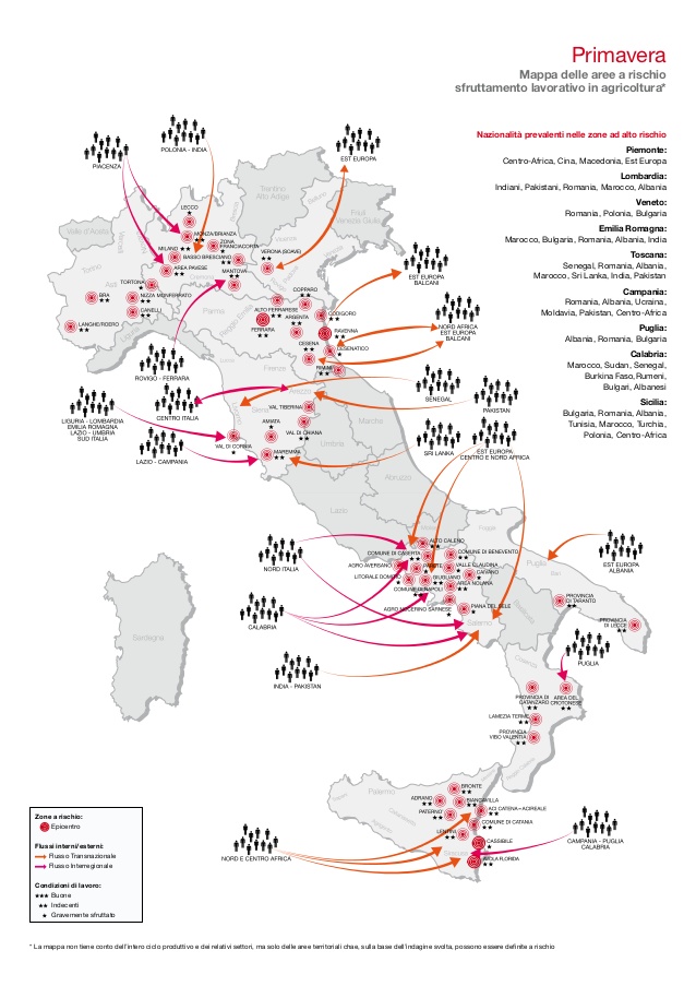 In Italia vive una popolazione di “invisibili”. Stranieri che lavorano nelle campagne, lontano dagli occhi dei centri abitati, spesso alloggiati in tuguri fatiscenti, sfruttati e mal pagati da caporali e imprenditori nostrani. Da nord a sud, il loro impiego nelle campagne è capillare. È anche grazie alle loro braccia se certi prodotti arrivano sulle nostre tavole, eppure la loro vita resta confinata nel silenzio. Secondo il primo Rapporto su caporalato e agromafie realizzato da Flai Cgil, si tratta di circa 700mila lavoratori tra regolari e irregolari, di cui circa 400mila coinvolti in forme di caporalato. Braccianti che si riversano ogni anno nella campagne in arrivo da altre nazioni o spostandosi internamente, tra le regioni italiane, per soddisfare i picchi della produzione e della lavorazione di prodotti agro-alimentari su tutta la penisola. Spesso protagonisti, loro malgrado, di storie di vulnerabilità e sfruttamento, al limite dellaschiavitù. NON SOLO SUD: SFRUTTATI DA BOLZANO ALLA TOSCANA. Diversamente da quel che si può credere però lo sfruttamento non riguarda solo il mezzogiorno, ma anche le zone più floride del nord, come Piemonte, Lombardia, provincia di Bolzano, Emilia-Romagna e Toscana (guarda la mappa completa). In tutti questi territori, come in Campania, Basilicata, Puglia, Calabria e Sicilia, i ricercatori della Flai Cgil hanno scovato datori di lavoro e imprenditori che truffano o ingannano i lavoratori stranieri, non corrispondendo loro i salari maturati, o facendoli lavorare in nero, accompagnando il trattamento con minacce più o meno velate e forme di violenza psico-fisica (manifeste o paventate). In Italia il mondo del caporalato si è evoluto, lo racconta nel rapporto Yvan Sagnet, portavoce dei braccianti che hanno organizzato lo sciopero di Nardò (Lecce) nell’estate del 2011 e oggi impegnato nella Flai-Cgil in Puglia: “Ci sono i caporali e ci sono i sotto-caporali. Perché i caporali nonpossono gestire tutto. Il caporale può avere quattro o cinque campi di raccolta e manda i suoi assistenti a gestire i lavoratori. Ha una squadra, ha gli autisti, degli assistenti, ha i cuochi. A Nardò c’era il ‘capo de capi’, era un tunisino. Poi c’erano altri caporali che lavoravano per lui. Nell’agro di Nardò erano tra 15 e 20 e controllavano tra i 500 e i 600 lavoratori”. PAGHE DA FAME: 4 EURO L’ORA. Le paghe per i lavoratori sono però sempre da fame. “Un bracciante agricolo che lavora nelle campagne di Foggia in Puglia, a Palazzo San Gervasio in Basilicata o a Cassibile in Sicilia verrà pagato a cottimo, ovvero 3,5 euro il cassone (per la raccolta dei pomodori), mentre verrà pagato 4 euro l’ora nelle campagne di Saluzzo nel Piemonte, di Padova, nel Veneto o a Sibari in Calabria per la raccolta degli agrumi. Il tutto in nero, su intere giornate comprese tra 12 e 16 ore di lavoro consecutive a cui vanno sottratti: i 5 euro di tasse di trasporto, 3,5 euro di panino e 1,5 euro diacqua da pagare, sempre al caporale”. MAFIA E RICICLAGGIO. A questa situazione di sfruttamento si somma la voracità dei gruppi mafiosi. Il caporalato, che è entrato nel codice penale solo nel 2011, è infatti un “reato spia” di infiltrazioni criminali nel settore. Una presenza significativa, ma ancora quasi del tutto inesplorata a livello giudiziario. Si stima che il giro d’affari connesso alle agromafie sia compreso tra i 12 e i 17 miliardi di euro, il 5-10% di tutta l’economia mafiosa. Quasi tutto giocato tra la contraffazione dei prodotti alimentari e il caporalato. Solo la contraffazione è cresciuta negli ultimi dieci anni del 128%, per un valore di 60 miliardi di prodotti che ogni anno vengono commercializzati nel mondo come falso Made in Italy. “L’agricoltura è anche uno dei settori prediletti per il riciclaggio dei soldi dalle organizzazioni criminali tradizionali – scrive Yvan Sagnet – Ad esempio l’agricoltura foggiana subisce forti condizionamenti da parte dellacamorra. Durante la stagione agricola centinaia di camionisti partono quotidianamente dalla Campania verso le campagne foggiane, affittano le terre ai contadini con il cosiddetto fenomeno del “prestanome”, e trasportano la merce verso le imprese del salernitano”. DAL CAMPO ALLA NOSTRA TAVOLA, LA FILIERA “INQUINATA”. Le mafie si occupano anche dei mercati dell’ortofrutta, infiltrando la grande distribuzione. “Le inchieste analizzate in quest’ultimo anno, svolte in particolare dalla Direzione distrettuale antimafia di Napoli, hanno visto implicate imprese di tutto il sud Italia con ramificazioni anche nel nord del Paese e hanno disvelato l’esistenza di un sistema di gestione dei grandi mercati agricoli nazionali pesantemente influenzati dalle organizzazioni mafiose”, scrive nel rapporto Maurizio De Lucia, magistrato della Direzione nazionale antimafia. Purtroppo neppure le nuove, e importanti, misure varate nel settembre del 2011 (introduzione del reato di caporalato) e nel lugliodel 2012 (concessione del permesso di soggiorno ai lavoratori che denunciano i propri sfruttatori), sono riuscite ancora ad incidere significativamente sulla grave situazione delle campagne. COSTO DEL LAVORO E CRISI. “Parliamoci chiaramente, per gli imprenditori il costo del lavoro italiano è altissimo. Ciò non giustifica l’assunzione di personale in nero, ma è indubbio che questo fenomeno esiste proprio per sfuggire alle maglie di questo meccanismo, soprattutto in questa grave crisi”. Il Procuratore di Foggia, Vincenzo Russo, non usa mezzi termini. “È come l’evasione fiscale. Quanto più alta è la tassazione, tanto più i soggetti sono invogliati ad evadere. Questo è indubbio. Quindi, se il costo del lavoro diminuisse, probabilmente diminuirebbero anche questi fenomeni”. Il Lavoro nero e caporalato sono fenomeni molto diffusi sul territorio nazionale, con particolari concentrazioni nel Mezzogiorno e in regioni del nord come Veneto, Alto Adige, Piemonte, Toscana e L