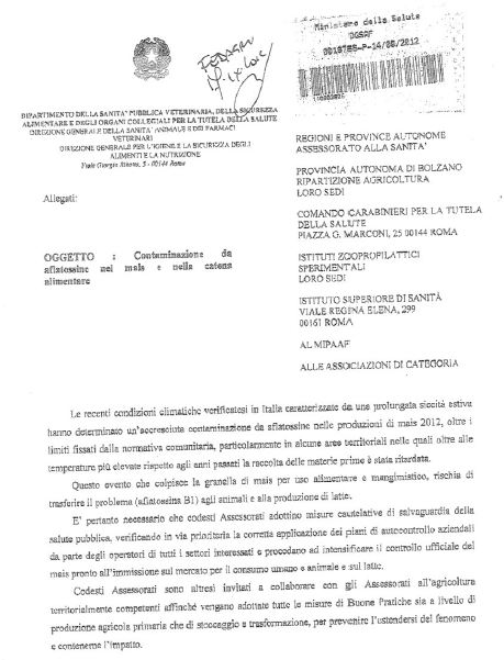Il 2 agosto 2012 la 9a Commissione permanente si è riunita per votare la risoluzione sulla “Questione inerente alla valutazione dell’impatto delle micotossine sulla filiera agroalimentare del grano duro” (nr. 398). Dopo qualche settimana dall’approvazione all’unanimità della risoluzione, il 14 settembre 2012, il “Dipartimento della sanità pubblica veterinaria, della sicurezza alimentare e degli organi collegiali per la tutela della salute” del Ministero della Salute, invia alle Regioni, alle Province autonome, al Comando dei carabinieri, agli Istituti zooprofilattici e alle Associazioni di categoria un Comunicato dal titolo: “Contaminazione da aflatossine nei mais e nella catena alimentare” (immagine a lato). In pratica il Ministero avverte che “le recenti condizioni climatiche verificatesi in Italia caratterizzate da una prolungata siccità estiva hanno determinato un’accresciuta contaminazione da aflatossine nelle produzioni di mais 2012,oltre i limiti fissati dalla normativa comunitaria”. La produzione di mais per uso alimentare e mangimistico per animali da macello sarebbe pesantemente contaminata da aflatossina B1. Questa aflatossina B1 una volta consumata direttamente dagli animali tramite il mais, può produrre latte e derivati contaminati dall’aflatossina M1 e questa intossicare il consumatore umano. E’ talmente seria la situazione che il Ministero invita tutti i responsabili dell’industria lattiero-casearia (centri di raccolta, stabilimenti termici e di trasformazione, ecc.) a fare continui esami di campioni di latte per verificarne la quantità di aflatossina. I risultati devono essere spediti ogni 15 giorni alla posta elettronica del Ministero riportata nell’allegato. Abbiamo intervistato il dottor Maurizio Proietti, medico membro dell’ISDE (International Society of Doctors for the Environment) e responsabile della Sezione di Patologia e Oncogenesi Ambientale presso l’Istituto Universitario Nicolausdi Bari, e anche il dottor Giuseppe Altieri, agroeconomo, docente di Entomologia-Fitopatologia all’Istituto agrario di Todi. Prima però cerchiamo di capire di cosa stiamo parlando. I funghi In Natura, gli esseri viventi si possono dividere in 3 grandi regni: - Animale: organismi in grado di muoversi e di nutrirsi di nutrienti organici già formati (Carboidrati, proteine, grassi, vitamine, etc.) - Vegetale: organismi immobili in grado di ricavare l’energia direttamente dal sole. - Funghi: organismi immobili come i vegetali, ma non essendo in grado di ricavare l’energia dal sole (fotosintesi clorofilliana) si sviluppano sulla sostanza organica viva e/o morta da cui attingere i nutrienti (foglie, residui di legno, alimenti, letame, animali morti, etc.). I funghi infatti sono una via di mezzo tra gli animali e le piante. Fanno parte dei funghi anche i lieviti e le muffe. I lieviti sono funghi formati da una sola cellula, e quello più noto è il SaccaromycesCerevisiae (lievito di birra che nutrendosi di zuccheri produce alcool, calore ed anidride carbonica). Le muffe invece sono funghi filamentosi che si presentano come batuffoli di cotone di vario colore e tonalità: bianco, grigio, verde, verde ardesia, blu, giallo, arancio. Le muffe si sviluppano sulla superficie di sostanze organiche in via di decomposizione e svolgono l’importante ruolo di trasformare in terriccio la sostanza organica. Molte muffe sono parassiti delle piante: oidio, peronospora, botritis cinerea, fumaggine, ruggini e la segale cornuta. Gli agricoltori per proteggere le colture usano pesticidi rivolti contro muffe, insetti e piante infestanti(1). Non tutte le muffe però sono pericolose per la salute, perché ve ne sono in grado di produrre antibiotici (muffa pennicillium). Le micotossine sono potentissimi veleni prodotti da molte muffe, tossici per la salute umana e animale ad azione cancerosa, genotossica, teratogena, nefrotossica e ancheneurotossica. Le micotossine sono numerosissime, ma le più dannose, sono: - Aflatossine B1, B2, G1, G2, M1, M2 e la Sterigmatocistina. - Acratossina A - Fumosine - Zearalenone - Tricoteceni - Acido Lisergico - Patulina Tra le aflatossine, le più pericolose sono la B1 e la M1 che favoriscono la cirrosi epatica e il tumore al fegato. Pericoloso per la salute è anche respirare queste micotossine. Micotossine e animali Le micotossine si sviluppano in molti vegetali (cereali, semi oleaginosi, frutta secca, ecc.), ma forse il problema più serio per l’uomo arriva tramite le proteine di origine animale. Le mucche infatti che mangiano foraggi (mais) e mangimi contenenti muffe, non solo daranno latte contenente aflatossine M1, ma i formaggi derivati da quel latte, avranno una concentrazione dell’aflatossina addirittura da 5 a 6 volte di più rispetto al latte di partenza, questo per via dell’accumulo! -------------- D: Gentile dottor Maurizio Proietti,lei è un esperto in materia di micotossine. Dopo l’allarme lanciato dal Ministero della salute, volevamo saperne di più: cosa sono le aflatossine? R: Sarebbe più corretto parlare di micotossine. Le micotossine sono metaboliti tossici di vari ceppi fungini, chiamati muffe. La contaminazione delle derrate cerealicole da parte di funghi produttori di micotossine rappresenta un pericolo per la catena alimentare animale e umana. Sono cancerogeni, teratogeni (creano deformazioni nella prole), mitogeni e deprimono il sistema immunitario. La contaminazione delle matrici alimentari avviene già sul campo, (tricoteceni, fumonisine, zearalenone) per seguire gli alimenti fino ai siti di stoccaggio (ocratossina A e aflatossine). D: Quali danni alla salute possono provocare le aflatossine? I danni alla salute sono diversi e dipende dal tipo di muffa o fungo. Aspergillus flavus e parasiticus producono Aflatossine che infestano prevalentemente arachidi, altre leguminose, maise altri tipi di cereali, semi oleaginosi, noci, mandorle, fichi secchi, latte e derivati; il danno che ne può conseguire è