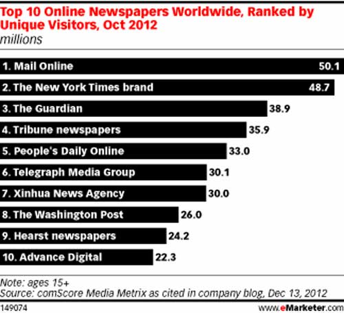 Sono stati 644 milioni i lettori dei giornali online di tutto il mondo a ottobre. Il dato, calcolato da comScore, è pari al 42,6% degli utenti mondiali di internet. Il più letto in assoluto è il Mail Online, il portale online del tabloid inglese Daily Mail, visitato a ottobre da oltre 50 milioni di navigatori. Ancora più interessante il secondo posto delle testate legate al brand New York Times (48,7 milioni), nonostante il fatto che parte dei loro contenuti siano consultabili solo a pagamento dal 2011. Nomi noti anche in terza e quarta posizione, occupate rispettivamente dal Guardian e dal Tribune. La presenza nella top ten del People’s Daily (quinto) e della Xinhua News Agency (settima) testimonia la grande crescita dell’audience di internet in Cina. Ad analizzare il "fenomeno" Mail Online è eMarketer: il sito britannico non ha molti contenuti in comune con il Daily Mail cartaceo e, a differenza del New York Times e del Guardian, non |